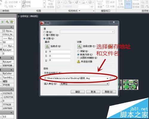 5、然后又就會出現圖中的命令框。這個時候我們在圖中標注的地方選擇我們保存的位置和文件名。(我這里就命名為“新塊1”,保存在桌面)最后點擊確定,就保存好了。