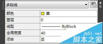 6、選中剛剛畫出的多段線,彈出多段線圖層框,在里面的全局寬度輸入一個數值,可以使該多段線看起來更加明顯,一般30-60即可。