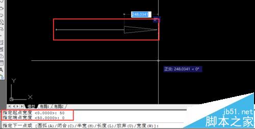 5、接下來在命令輸入框內輸入指定起點寬度和指定終點寬度,指定起點寬度可以設置成50,指定終點寬度設置為0,這樣剛好顯示一個箭頭,如下圖所示。