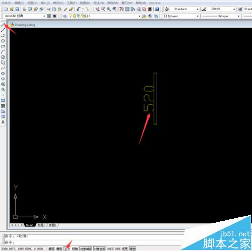 2、打開cad軟件,同時,設置正交功能,用直線畫一條520mm的豎線。