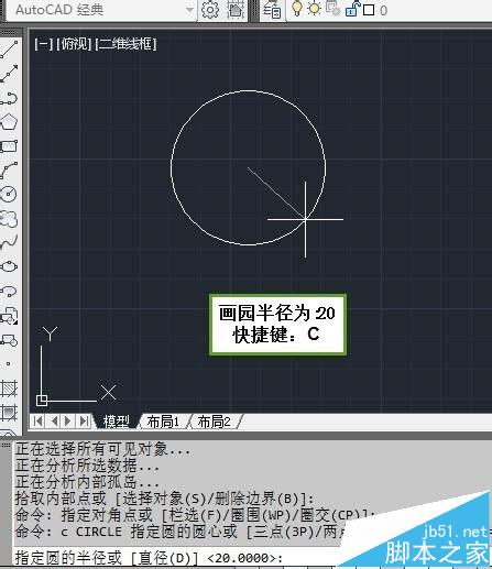 1、畫一個半徑20的圓,你也可以畫其他半徑,只要胖瘦掌握好看就ok。畫圓快捷鍵C——隨便選一個點為圓心——輸入半徑20——空格或者回車!