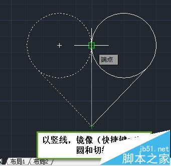5、以豎線上下端點鏡像圓和切線。鏡像快捷鍵mi——空格——選擇圓和切線——空格——選擇豎線上下端點——要刪除源對象嗎——輸入N——空格——鏡像完成。