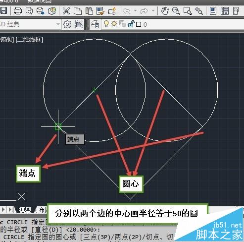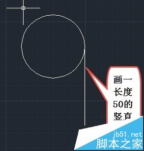 3、在圓的最左邊或者右邊象限點,為起點向下畫豎線長度為50-60,我選擇50。畫直線快捷鍵L,豎直向下輸入長度50——空格或者回車