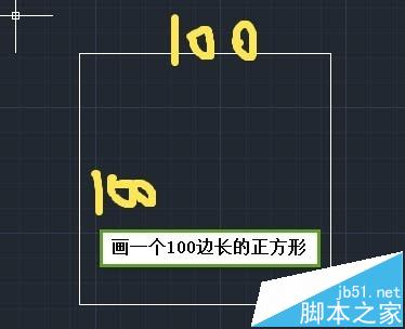 1、繪制一個邊長為100的正方形,快捷鍵rec——空格-輸入相對坐標@100,100——空格。