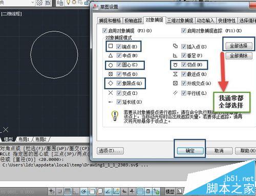 2、打開對象捕捉——勾選象限點,切點,和圓心,端點。——我比較懶就直接全部選擇了——確定