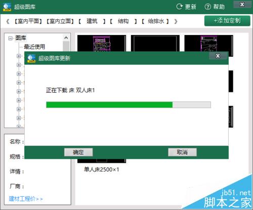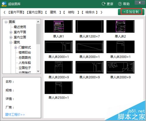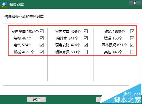 3、點擊右上方的【添加定制】選項按鈕,彈出添加定制圖庫選項,勾選要添加的圖形,如果室內平面平時用的比較多,就選擇勾選該類型的圖庫,當然,也可以全部勾選備用,如下圖所示。