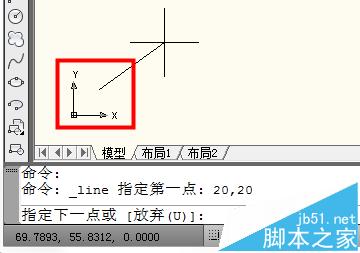 2、此時會將cad直線的起點定位在相距坐標遠點x軸和y軸為20距離的點上。
