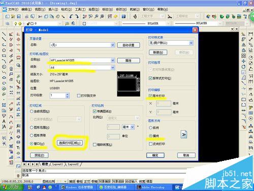4、在彈出的對話框中,依次選擇打印機“名稱”“紙張”“居中”“布滿圖紙”“窗口”,最后點“選擇打印區域”