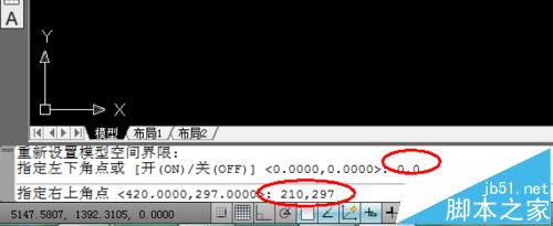 3、設置圖型界限。如果,你想設置A4紙大小,就要繼續輸入0,0;210,297。如下圖一。當然A3的紙大小是297mmχ420mm,那么,你就要在命令框中輸入 0,0 ;297,420。