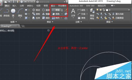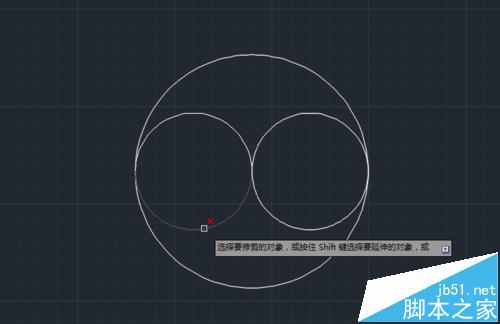 4、接下來我們使用修剪工具,點擊修剪工具,再按一下enter鍵或者單擊一下鼠標右鍵,然后移動到小圓上如圖進行修剪。