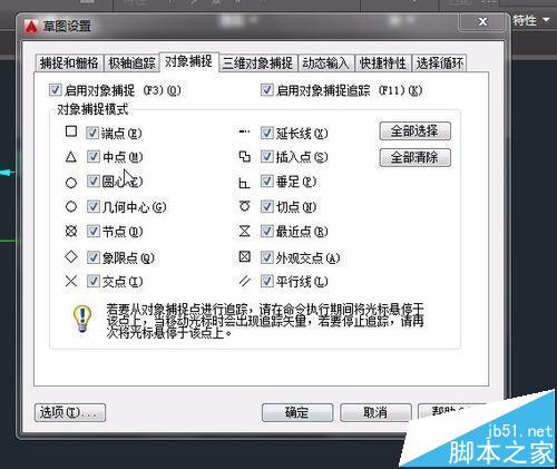5、這時就要思考了,自動追蹤一定與對象捕捉有關,我打開對象捕捉的對話框。有時候畫圖是經常為了快,經常勾選那個全部選擇。