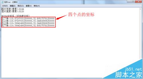 輸出完成后打開輸出文件所在的文件夾,可以看到生成了一個tif和一個txt兩個文件(圖4),打開txt文件我們可以看到下載的圖片的四個角的坐標(圖5),稍后我們將會使用到這4個坐標值。