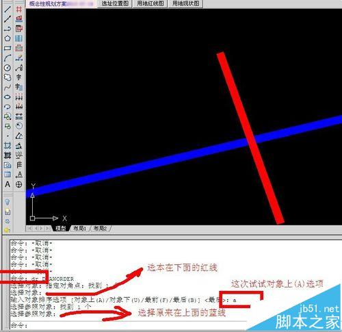 同理,輸入A,回車,再選擇藍線,也可以達到目的(即把紅線這個對象置于藍線這個對象之上)。