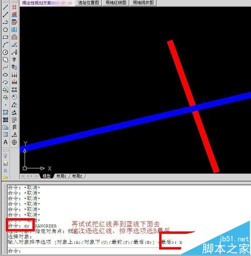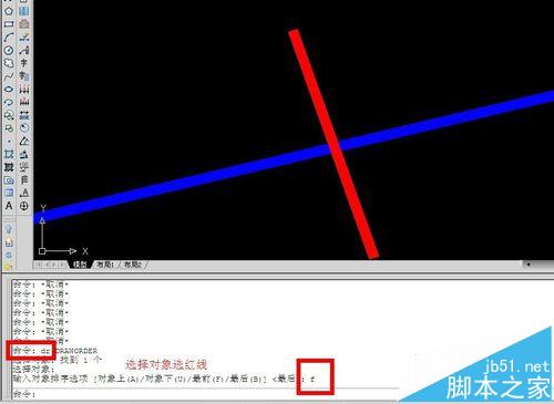 命令行提示選擇對象,這時選擇藍線,回車,提示“輸入對象排序選項 [對象上(A)/對象下(U)/最前(F)/最后(B)]”,這里我們輸入B,回車。可以看到藍線到了紅線之下。