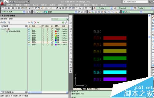 4、以上為插件加載過程,其他插件加載過程也是用這種方法。下面以一個簡單的實例來說明下圖層管理插件的使用,如圖所示:在cad中分別建立8個圖層,使用不同顏色來區(qū)分