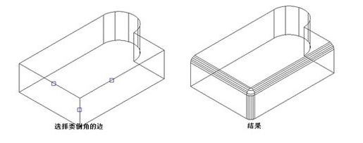 CAD的Fillet命令不僅可以對二維線形進行倒角,也可以對三維實體進行倒角。當選擇三維實體上需要倒角的邊時,會提示輸入圓角半徑,輸入半徑后可以選擇一條或多條邊同時倒圓角,如下圖所示: