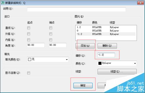 4、彈出新建多線樣式窗口,在圖元中點擊添加按鈕,將一項偏移改為1.2中間為0第三項改為-1.2點擊確定。