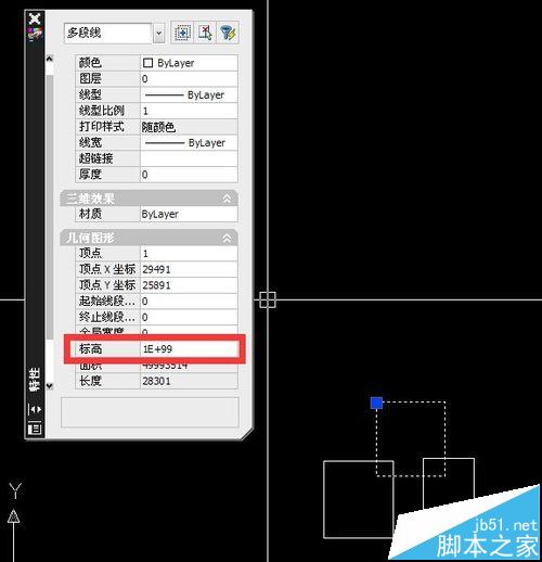 5、[此步為驗證步驟,可省略]可以選中其中一個或全部圖形,點擊Ctrl+1快捷鍵或其他方式打開“特性”對話框,查看其中的“標高”一項,發現數值已變為1E+99,即無窮大處。