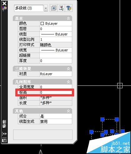 8、[此步為驗證步驟,可省略]可以選中其中一個或全部圖形,點擊Ctrl+1快捷鍵或其他方式打開“特性”對話框,查看其中的“標高”一項,發現數值已變為0,即Z軸已歸零。