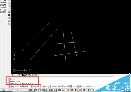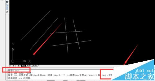 2、我們現在布局一中,用ucs——w——空格鍵——空格鍵——沿著需要變換的方向拉一條線(比如圖中的1這條線段)——空格