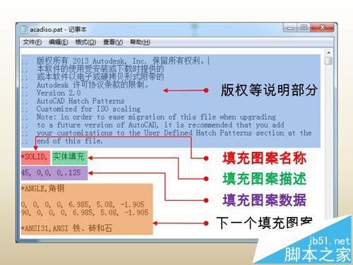 如下圖中以公制文件為例,紅色陰影部分前面的星號為一段圖案代碼的開始標(biāo)記,緊跟其后的字母為填充圖案的名稱,用以顯示在cad填充命令中;綠色陰影部分為圖案的說明描述;下一行紫色部分為填充圖案的數(shù)據(jù),包含了圖案的角度、長度、間距等信息。每個圖案的數(shù)據(jù)從一個“*”開始,直至下一個“*”前結(jié)束。