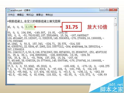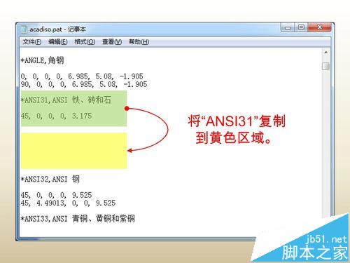 1、將“ANSI31”圖案的所有數(shù)據(jù)復(fù)制到記事本中的空白區(qū)域(即圖中的黃色區(qū)域)。注意,一定不要插入到其他圖案數(shù)據(jù)當(dāng)中,以免造成混亂。