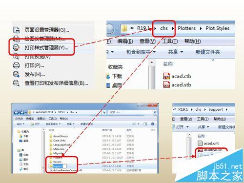 方法二:你嫌麻煩,這里還有一個簡便的方法找到這兩個文件:在cad“文件”菜單中點擊“打印樣式管理器”,跳出Plot Styles文件夾,再向上返回兩級到達(dá)“chs”文件夾,然后在此文件夾中找到“support”文件夾并進(jìn)入,此時就可以找到兩個后綴名為“.pat”的文件了。
