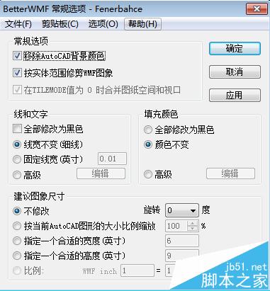 3、轉到BetterWMF應用程序界面,選中常規選項中的”移除AutoCAD背景顏色“和”按實體范圍修剪WMF圖像“;在線和文字中,選擇全部修改為黑色,我一般使用固定線寬0.025英寸或默認。然后選擇剪貼板菜單中的”立即修改和替換“,單擊”應用“;如下圖所示: