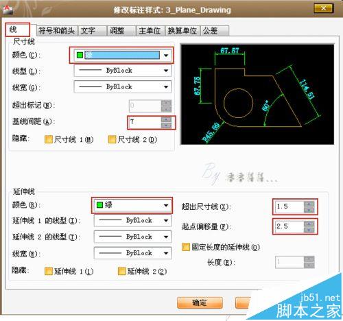 3、進入“線”設置:“尺寸線”指數字下的橫線(箭頭和尺寸線是同樣的顏色);“延伸線”指2根長豎線。參數參照下圖進行修改。