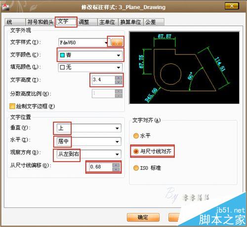 5、進入“文字”設置:首先選文字樣式,主要就是選字體,點“...”進入,選宋體或其他的字體;然后修改文字大小3.4;然后修改文字位置和文字對齊方式。文字對齊方式選“與尺寸線對齊”是最好用的。其他的兩個也可以試試,看看有什么區別。