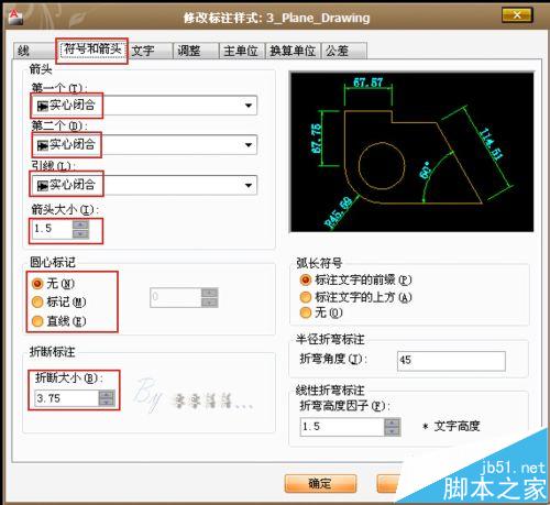 4、進入“符號和箭頭”設置:先修改箭頭的樣子,然后修改箭頭的大小;圓心按習慣,都可以選,影響不大。其他的參下圖進行設置