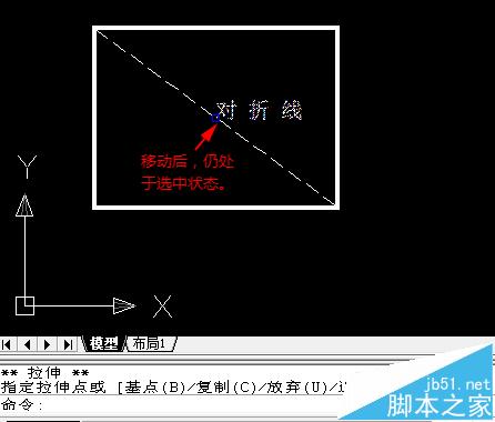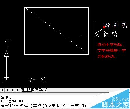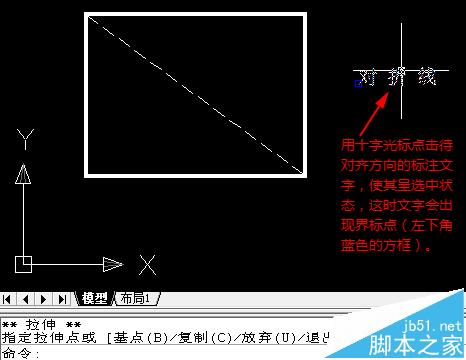 6、繼續(xù)拖動(dòng)十字光標(biāo)(文字也隨著移動(dòng))靠近虛線中點(diǎn),直到出現(xiàn)黃色三角形的對(duì)象捕捉標(biāo)志時(shí),點(diǎn)擊鼠標(biāo)左鍵。這時(shí),文字就被移動(dòng)到了虛線旁,且仍處于選中狀態(tài)。