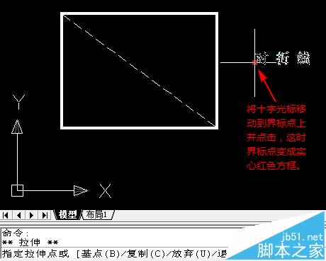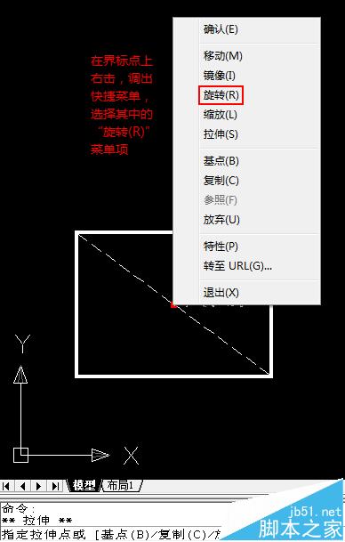 7、再次鼠標(biāo)左鍵點(diǎn)擊界標(biāo)點(diǎn),使其變紅。緊接著再點(diǎn)鼠標(biāo)右鍵,調(diào)出界標(biāo)點(diǎn)快捷命令菜單,選中其中的“旋轉(zhuǎn)(R)”菜單項(xiàng)。拖動(dòng)十字光標(biāo),可以發(fā)現(xiàn)文字已經(jīng)開(kāi)始繞界標(biāo)點(diǎn)(也就是虛線中點(diǎn))旋轉(zhuǎn)了。