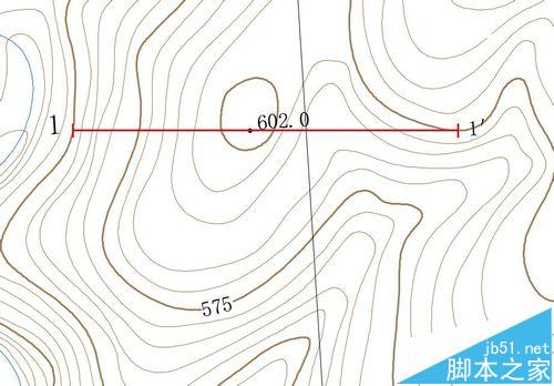 1、以下圖中紅線為剖面線繪制地形圖剖面,首先確認(rèn)剖面線起點(diǎn)高程,下圖剖面線1-1′起點(diǎn)高程為550,等高距為5米,