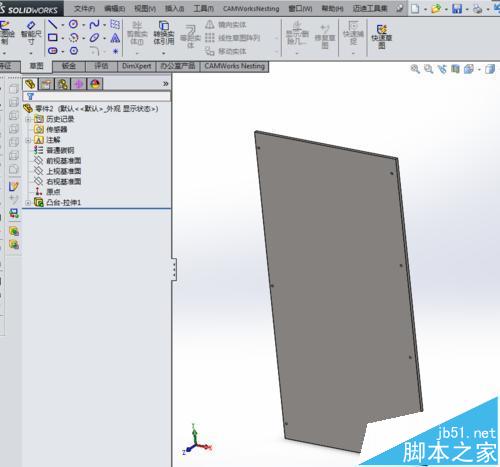 4、對草圖進行定位標注后,使用solidworks拉伸命令,拉伸零件,結果如下圖。