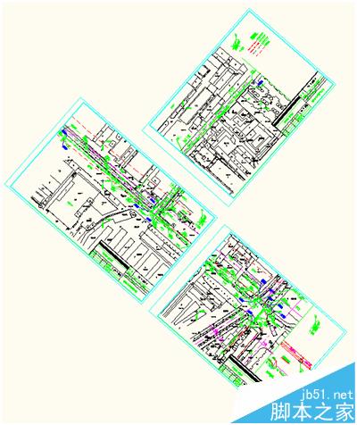 有時,一副竣工圖中會將CAD數據分成好幾塊(如第一個圖),這時就需要先確定指北針方向,看各個圖塊的正北方向是否在屏幕中豎直向上(90°),若并非如此,就需要將其進行“旋轉”(‘ROTATE’命令),將其正北方向調到屏幕豎直向上的方向。然后利用“平移”工具(‘MOVE’命令),以圖塊間公共點為基點,將分開的CAD數據進行重新合并。