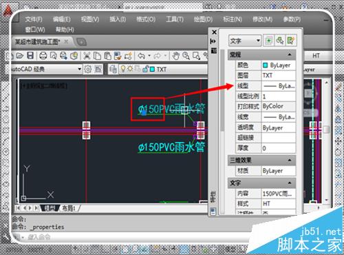 2、點(diǎn)擊一下這個(gè)“雨水管”的文字,然后使用組合鍵“ctrl+1”調(diào)出特性對(duì)話框,或者右鍵點(diǎn)擊文字,選擇“特性”進(jìn)行打開。