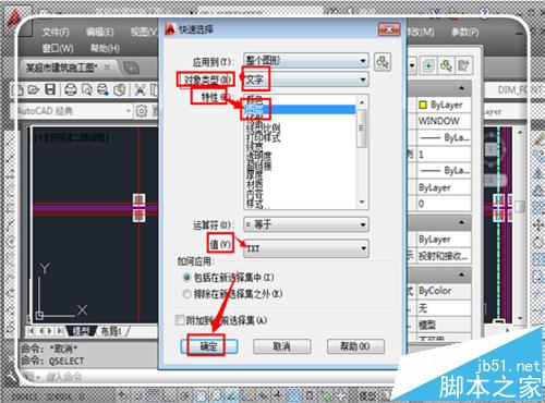 5、進(jìn)入快速選擇界面,這里,“對(duì)象類型”選擇“文字”;特性選擇“圖層”,“值”選擇“TXT(以你剛才記下的為準(zhǔn))。點(diǎn)擊“確定”。