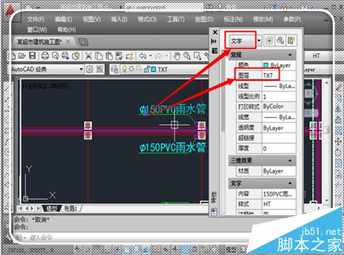 3、這里基礎(chǔ)本圖層的三個(gè)重要信息:“文字”、“圖層”“TXT”(你的估計(jì)不一樣,以你的為準(zhǔn))。然后點(diǎn)擊一下esc取消文字選中。