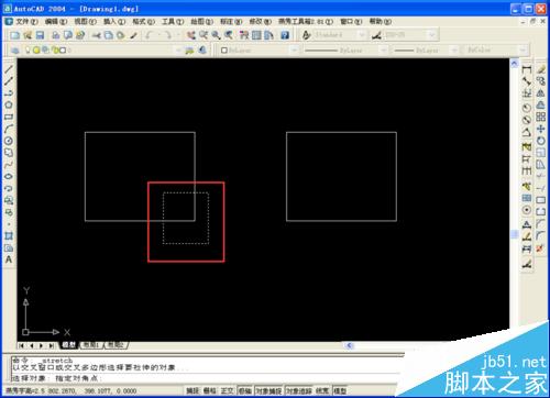 1、按s+空格鍵或者點擊拉伸命令——鼠標變成小方框——接著選著拉伸邊或者點