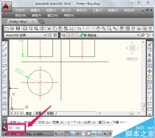 1、首先用cad打開圖紙,在命令欄中輸入cad復制快捷鍵“co”,然后回車。