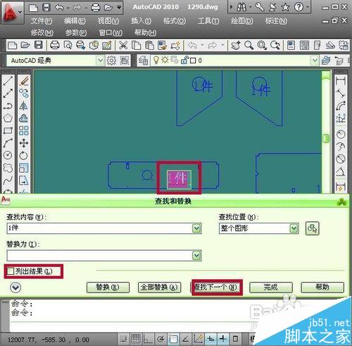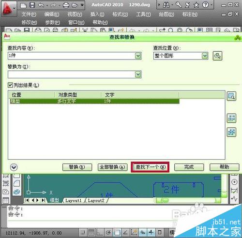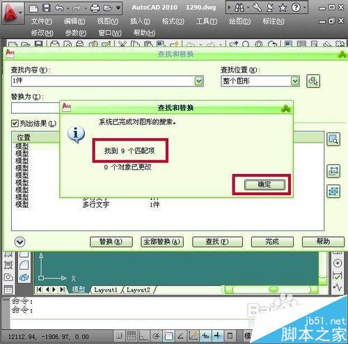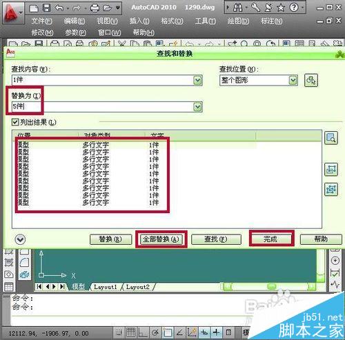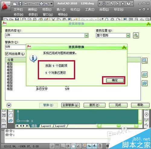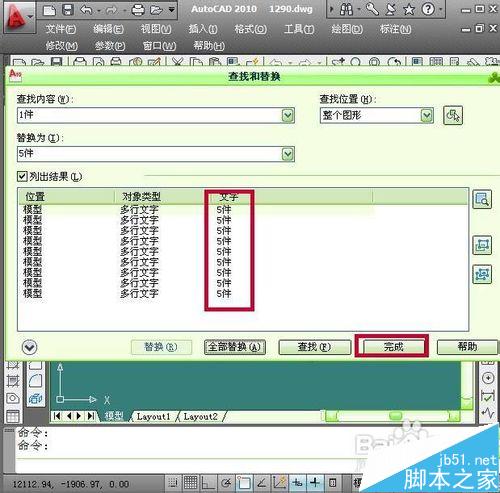 10、點擊確定以后再列出結(jié)果欄里面就會看到文字內(nèi)容已被修改然后點擊窗口下面的完成按鈕退出查找和替換窗口,就會看到圖形中的內(nèi)容已被替換完成。