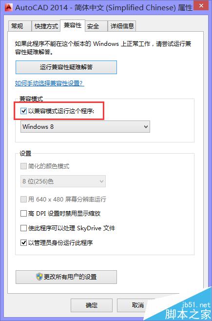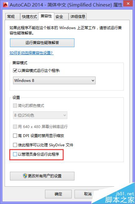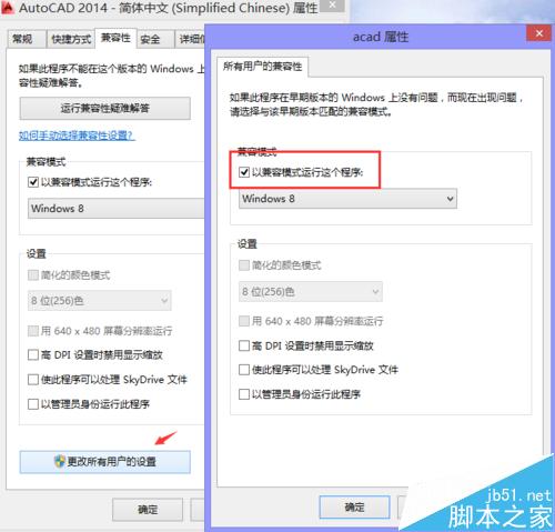 5、在點擊屬性對話框下面的【更改所有用戶的設置】,在彈出的對【CAD屬性】話框中同樣把【以兼容模式運行這個程序】打勾,把【以管理員身份運行些程序】勾去掉,就OK了。