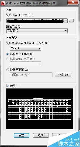 5、選中Excel文件確定之后,出現如下圖對話框,此對話框中要注意的是:一是你選擇的工作表(EXCEL中有sheet1、sheet2等工作表,選擇你需要的表格數據所在的工作表);二是在”鏈接整個工作表“與”鏈接至范圍“中選擇”連接至范圍“選項,在輸入框中有”例如A1:M9“幫助你如何選擇你所要導入CAD中表格數據。