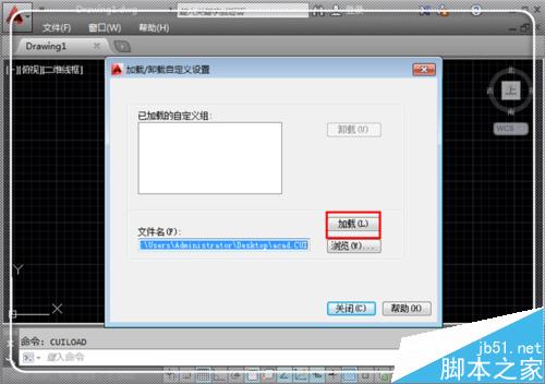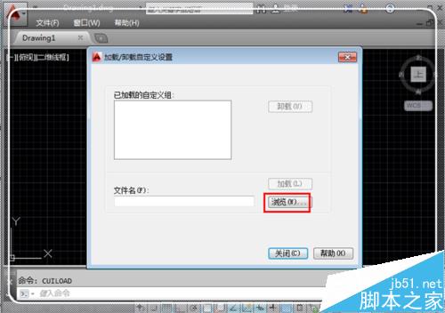 3、CAD中彈出,點擊“加載/卸載自定義設置”對話框”左下方的“瀏覽”,去查找文件。