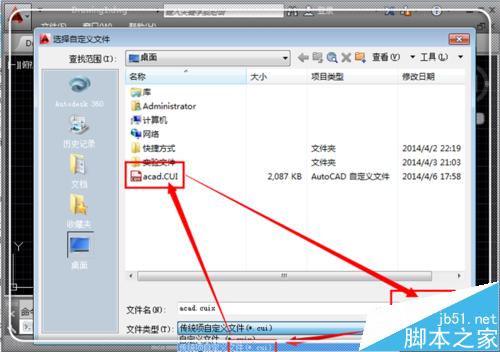 4、先點擊文件類型后面的倒三角形,找到后綴為.cui的類型,點擊選擇,然后找到你剛才下載的“acad.cui”文件,點擊它選中,然后點擊“打開”。