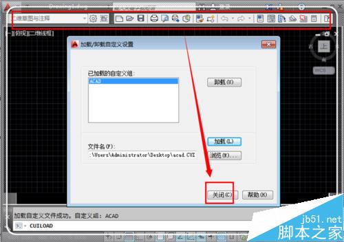 2、打開cad,點擊出問題的“確定”按鈕,然后在命令欄輸入“CUILOAD”,然后點擊回車。