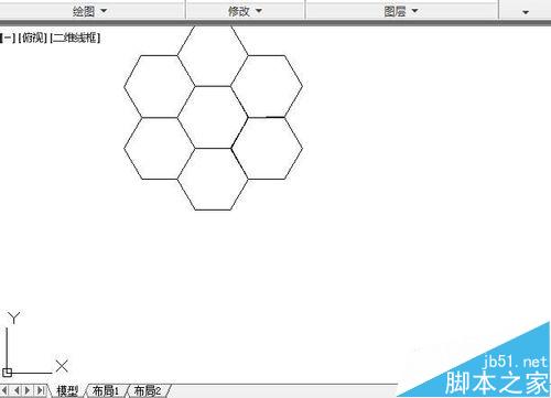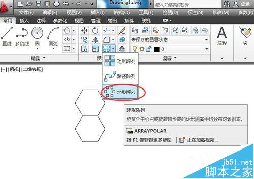 兩個正六邊形拼接起來了。接下來,要利用環形陣列工具,進行復制和拼接。單擊環形陣列工具,選中上下兩個六邊形,右擊確認,在命令編輯欄輸入中心坐標:1500,2000,回車。輸入項目數:6,確認。