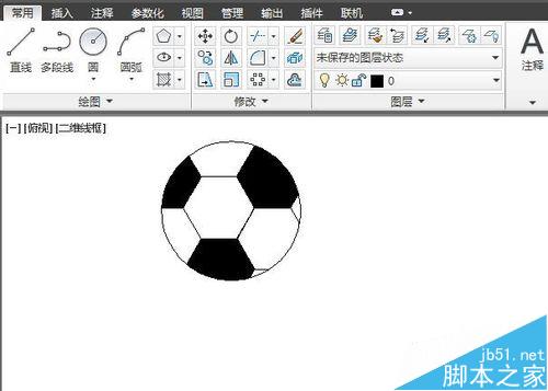今天我教大家畫一個足球。打開CAD,設置空間工作空間為草圖與注釋。背景為白色,不顯示柵格。按功能鍵F7可以在顯示和隱藏柵格之間切換。單擊常用工具欄里的多邊形工具,準備畫正六邊形。