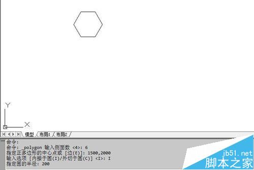 在命令編輯區內輸入側面數:6,回車;輸入正多邊形中心坐標:1500,2000,回車。輸入內接代碼:I,回車確認。輸入半徑200,回車。這樣正六邊形就畫好了。這里要精確定位,所以有關參數使用命令輸入方式。